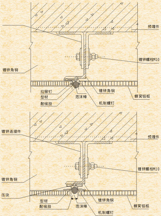 五、鋁蜂窩板幕墻的框架應(yīng)使用表面經(jīng)陽極氧化處理的鋁型材,不可使用鋼型材。因框架與壁板若是2種不同的金屬,容易產(chǎn)生電極電位差,使鋁板受到腐蝕。高層建筑鋁蜂窩板幕墻框架使用的鋁型材厚度不得小于3mm。安裝壁板時要使用不銹鋼螺絲或鍍鋅螺絲,不能使用普通螺絲。框架系統(tǒng)的每根豎料應(yīng)與主體結(jié)構(gòu)的預(yù)埋減牢固連接,橫料與豎料間再以不銹鋼螺栓固定,保證安裝后耐久性。
